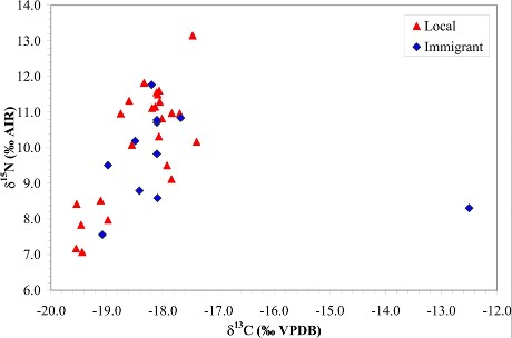 There were no statistically significant differences in a two-tailed t-test between the perimortem diets of locals and immigrants (Fig. 2). However, one immigrant stood out for having a startlingly high d13C value, likely indicating he was consuming large quantities of millet, the most abundant C4 plant in the area, in the years before his death. A 2.5-year-old child also stands out with a high d15N, likely indicating the child was still nursing or had been recently weaned.